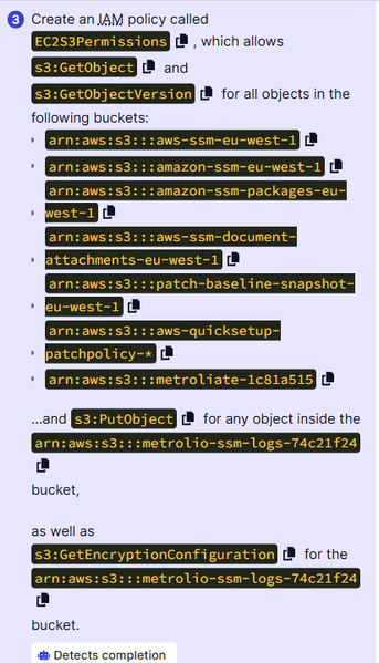 Hi. I'm trying to complete the final lab in the AWS Systems Manager: Demonstrate your skills lab. I'm trying to create an IAM policy as requested, but it isn't being accepted. Here is the questi...
