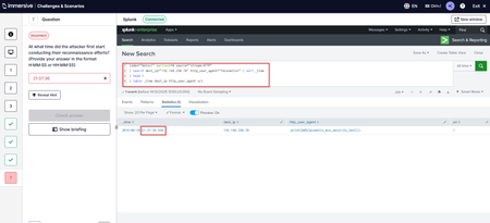 I'm stucked at question 7 (At what time did the attacker first start conducting their reconnaissance efforts? (Provide your answer in the format H:MM:SS or HH:MM:SS). The answer I get is 21:37:36 as ...