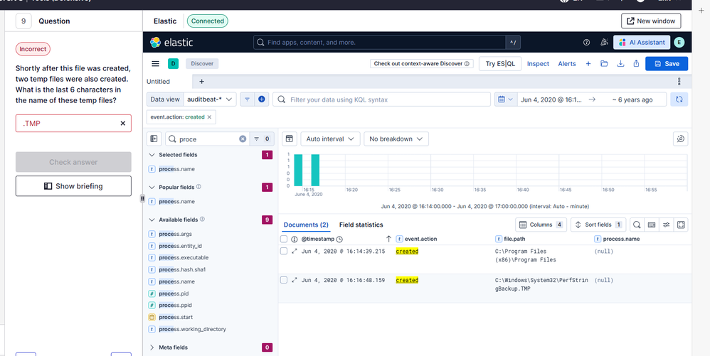 I have found the answers to all the other questions including 10 but I don't quite understand what Q9 is asking for when it says "Shortly after this file was created, two temp files were also created. What is the last 6 characters in the name of these temp files?" . I have found the files created after q8 answer see below