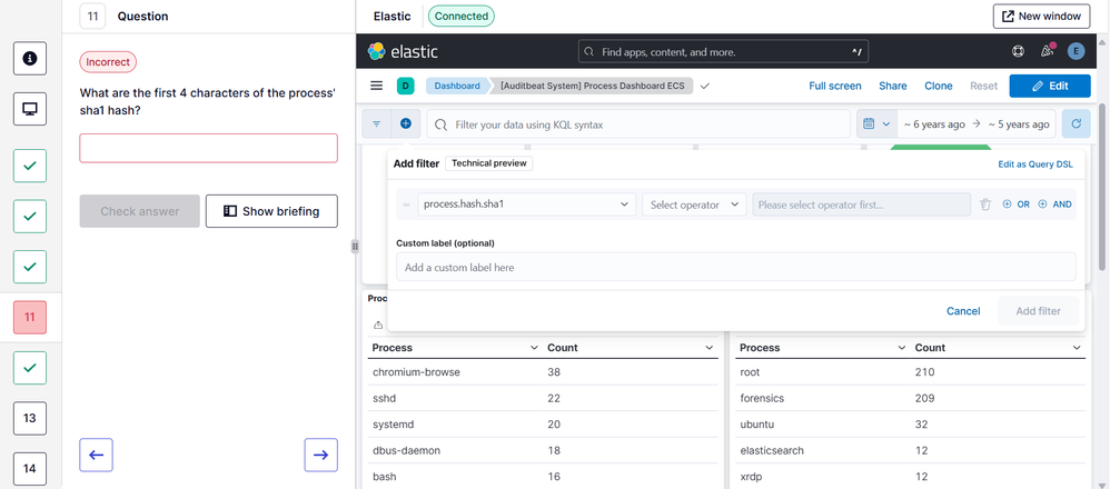 I'm stuck on Q11 of this lab and would greatly appreciate some help, please. I'm a little confused as to how to go about answering the question? If I use the filter for - Processhash.sha1 IS 4, I get 0 which is incorrect.