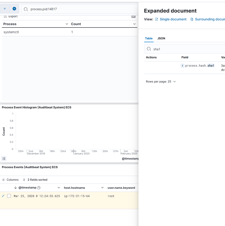 When you identify the process from the Process Events [Auditbeat System] ECS dashboard at the bottom, expanding by clicking the 2 way arrow symbol will allow you to search for the SHA1 value for that process.