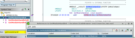 Hi all, I'm stuck in this part, where using Ghidra, I have to find where the Windows API GetModuleHandleA is used, in the binary called exercise_two.exe, and once located, find the parameter of thi...