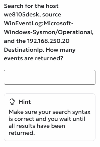 Hi SushiPanda As you can see, the DestinationIp field is not automatically extracted, even if you switch to Verbose mode. You can try and extract "new fields" that contain this value and look through results, which should help practice SPL more ;) or remember to chain in your search the correct field name.