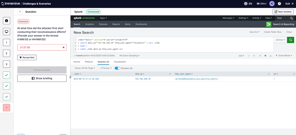 I'm stucked at question 7 (At what time did the attacker first start conducting their reconnaissance efforts? (Provide your answer in the format H:MM:SS or HH:MM:SS). The answer I get is 21:37:36 as shown in screenshot, but it's saying its wrong. PLEASE HELP