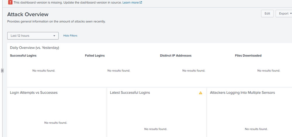 Was trying to do the threat hunting cowrie honeypot but when trying to access the 'Tango honeypot intelligence' part of splunk it told me the dashboard version was missing and all data and results are not showing.
