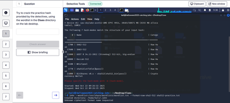 Hello Immersive friends, So I'm a little stuck on Q1 for this lab and would greatly appreciate any form of help :-) If I am correct in my thinking, I have used the command 'Hashcat' for txt. file...